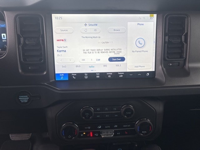 NEW, APPLE CAR PLAY/ANDROID AUTO, SYNC4, BUMPER FRONT & REAR PWDR STD STEEL, FENDER TIE DOWN HOOKS, FULL VEH STEEL BASH PLATES, LED SIGNATURE LIGHTING, MIRRORS HEATED POWER GLASS MANUAL FOLD, TOW HOOKS FRT(2)/REAR(2), AUX SWITCHES W/PRE WIRING, CRUISE CONTROL, DIGITAL INSTRUMENT CLUSTER, MOLLE STRAP SYSTEM, 12 LCD CENTER STACK TOUCHSCREEN, ADVANCED 4X4, BADLANDS SUSPENSION, FORDPASS, FRONT/REAR LOCKING DIFFRNTL, FRONT STA-BAR DISCONNECT, HILL START ASSIST, PRE COLLISION ASSIST W/AEB, PUSH BUTTON START, REAR VIEW CAMERA, TERRAIN MANAGEMENT W/G.O.A.T. MODES, TOOL KIT-DOOR/TOP REMOVAL